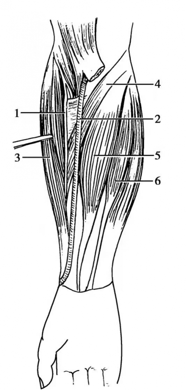 图2 前臂桡神经浅支解剖 1.桡神经浅支;2.桡动脉;3.肱桡肌(已勾开);4.旋前圆肌;5.桡侧腕屈肌;6.掌长肌
