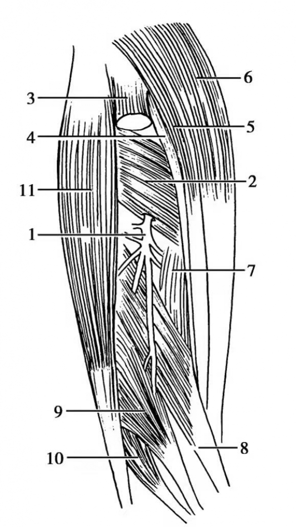 图4 前臂桡神经深支解剖1.桡神经深支;2.旋后肌;3.指总伸肌(已切断);4.桡侧腕短伸肌;5.桡侧腕长伸肌;6.肱桡肌;7.拇长展肌;8.拇长伸肌;9.拇短伸肌;10.示指固有伸肌;11.尺侧腕伸肌
