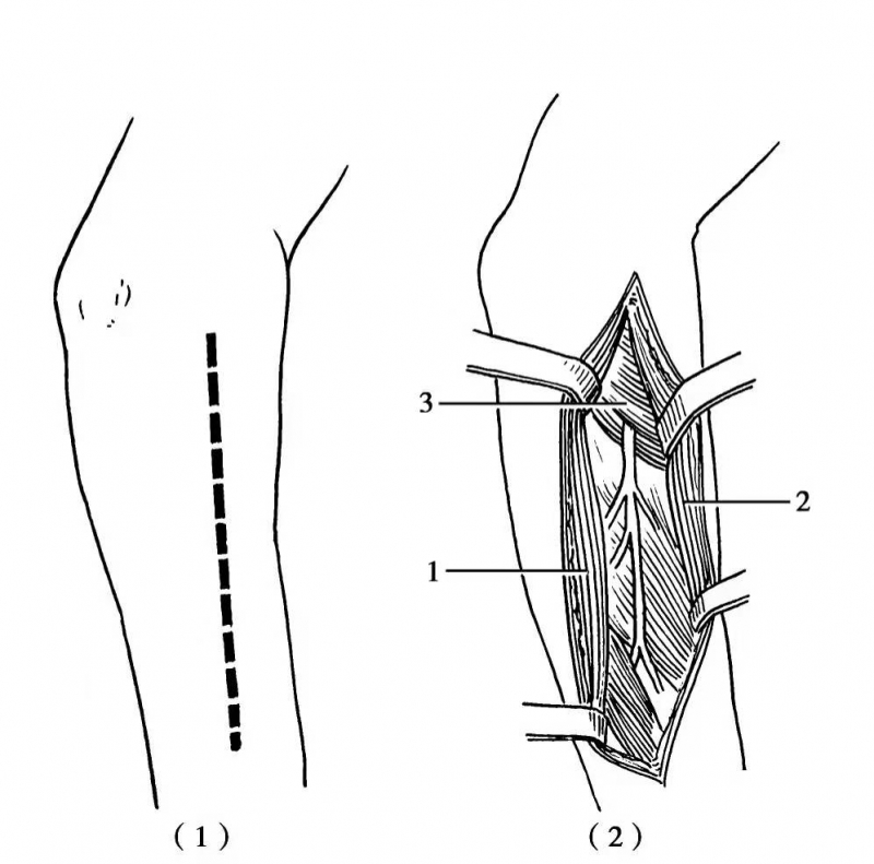 图9 前臂背外侧切口显露桡神经深支(1)切口;(2)分开指总伸肌 1.与桡侧腕短伸肌;2.的肌间隙便能显露桡神经深支,从旋后肌;3.穿出后的一段神经