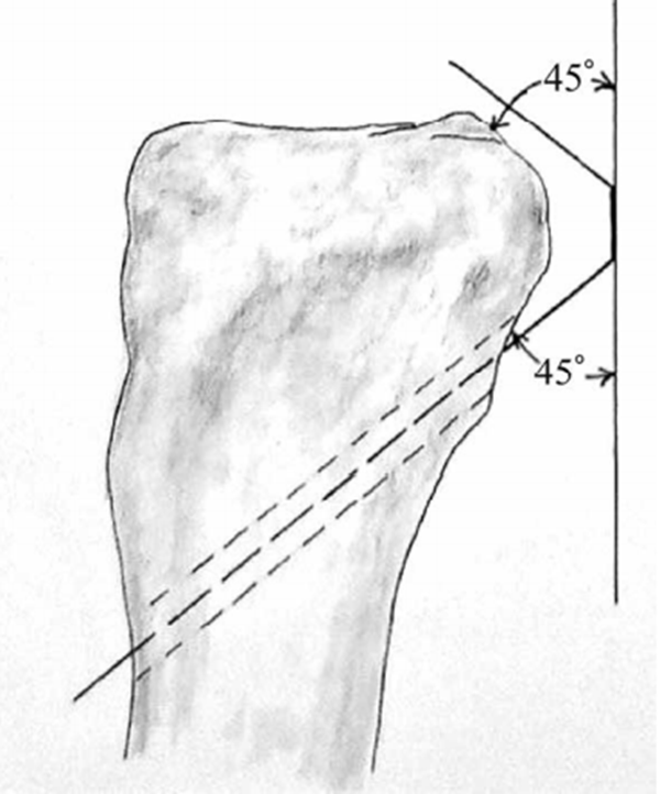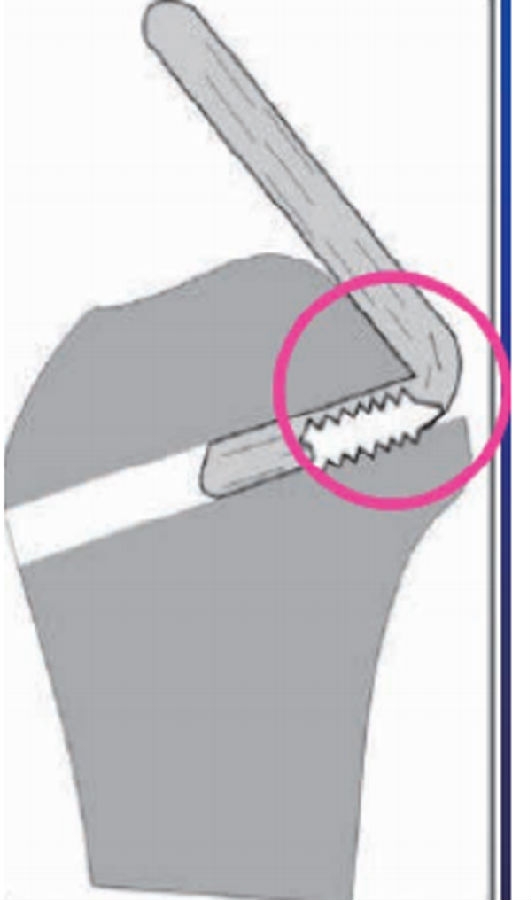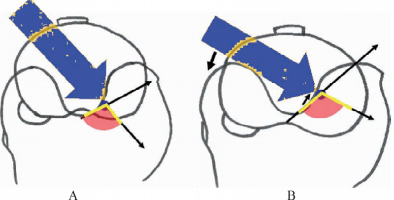 如在原PCL止点斜坡解剖重建PCL胫骨止点,移植物在胫骨出口处压在锐角的骨隧道一侧,造成移植物切割损伤,称为杀手转角