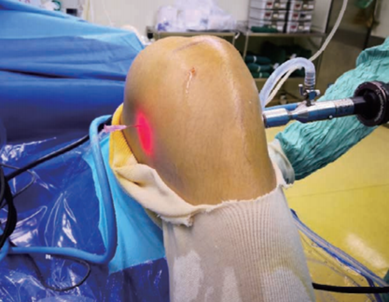 从膝关节后外侧入路经后外侧间室,穿过后纵隔到后内侧间室,光源照射直视下做后内侧入路