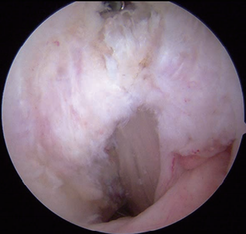 首先在关节镜下探查确定PCL断裂情况(图1)。单束重建是多数学者最常用的手术。取腘绳肌腱编制成4股移植物,探查时尽量保留PCL残端。