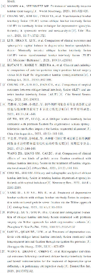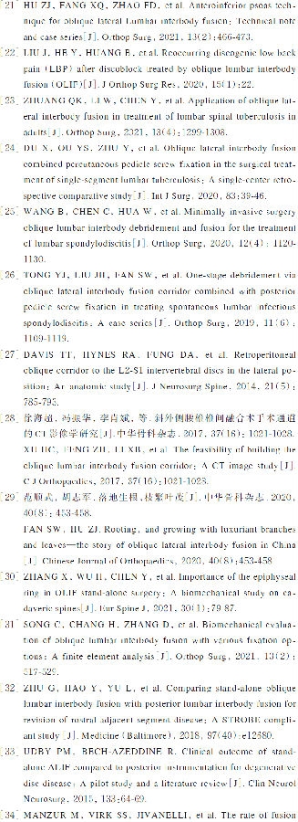 俞仲翔等[6]研究证实,对于邻椎病的治疗,OLIF可以取得与后路腰椎椎间融合术(posterior lumbar interbody fusion,PLIF)等经典手术方式同样的效果,且能够缩短手术时间,减少并发症的发生。王志强等[15]研究证实,OLIF联合单侧或双侧的椎弓根螺钉固定均可有效治疗腰椎退行性疾病。CHO等[16]研究表明,对于存在矢状位失衡的退行性脊柱侧弯患者,OLIF联合后路螺钉治疗比传统的PLIF更加有效。因此,经典的OLIF技术可以应用于脊柱侧弯、脊柱滑脱、腰椎椎管狭窄等众多腰椎退行性疾病的诊疗。