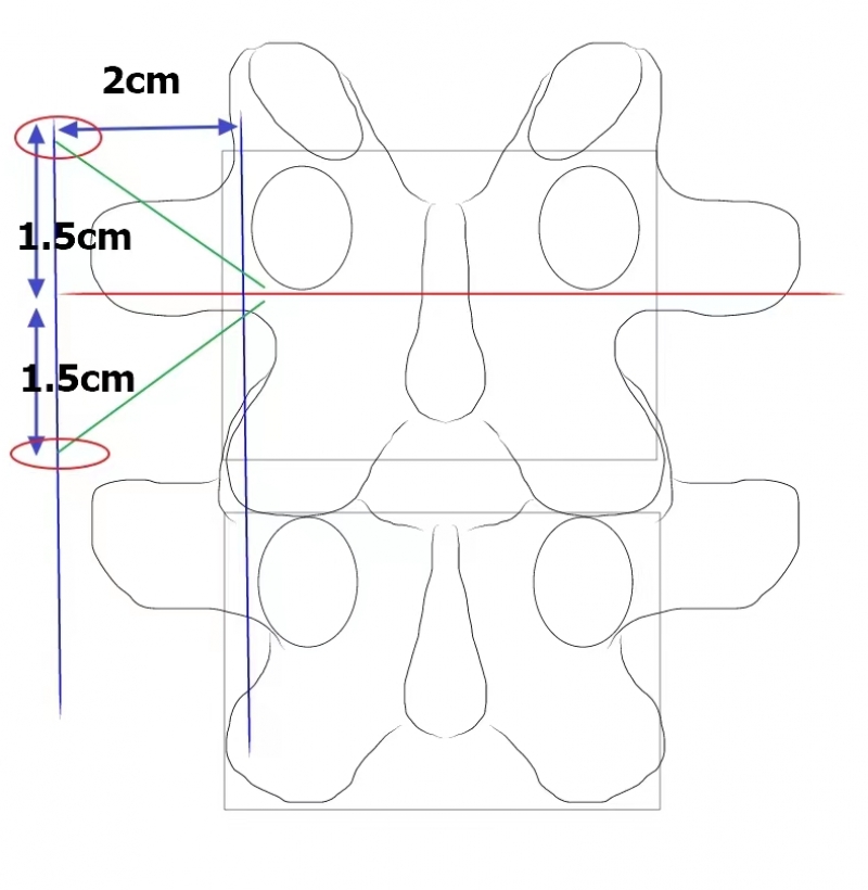 其次,透视正位。红线是临床医生通过侧位定位的椎弓根螺钉置入的水平线,蓝线为棘突中线,椎弓根内外缘线。笔者喜欢从椎弓根“鹰眼”中份作为切口的起始点,向外做切口。