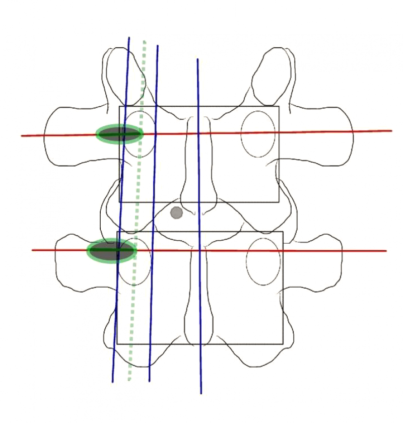 以左侧为例。镜子器械最初的目标点位于棘突与椎板的交接部位,以此做一横行标记线(红色),沿椎弓根内缘画一标记线(蓝色)。