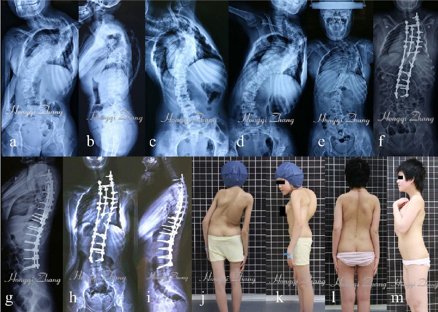 a,b术前患者X线正侧位示患者冠状位主弯Cobb角为142.2°;c,d术前患者Bending位片,Cobb角为122.4°,柔韧性为13.92%;e经过湘雅阶梯递进式大重量Halo-股骨髁上牵引后,患者Cobb角降到88.2°,改善率为37.97%;f,g单纯后路矫形术后,患者Cobb角降到53.6°,矫形率为62.31%;h,i术后24个月随访,Cobb角为55.2°,无明显丢失;j-m患者外观、冠状位及矢状位平衡得到了极大的改善