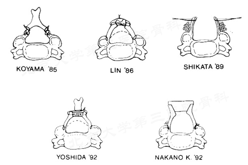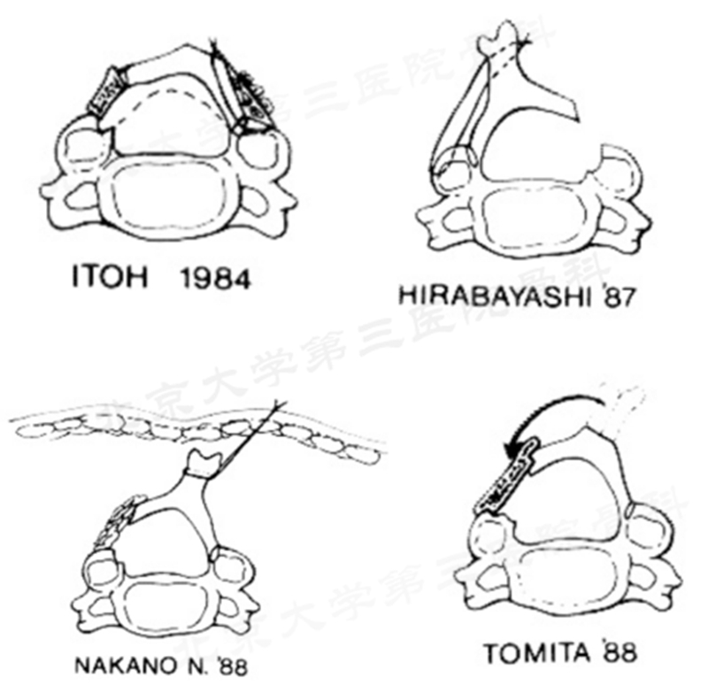 在1985年Itoh发表的文章称,这种改良的Itoh法使患者椎管直径平均增加了4.1mm,且在术后平均18个月的随访期间内,椎管直径未见明显缩小。但在后续的临床实践中发现,由于Itoh法同样属于软性固定,可能因固定线的撕脱导致椎板回落。并且在操作过程中,易损伤颈神经背支,而使患者出现长期的颈部牵涉痛。