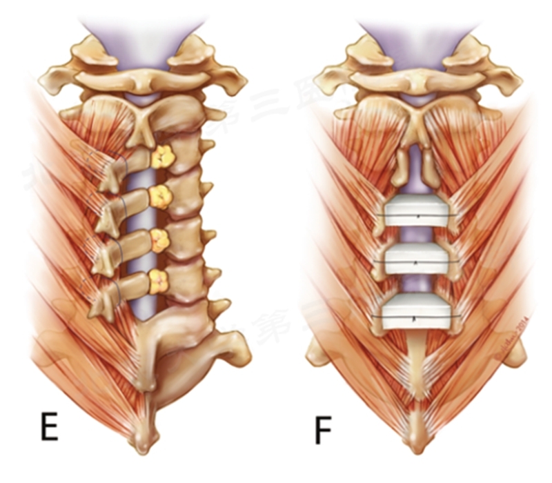 因此,许多学者开发出了针对于保护棘突的肌肉附着并重建后部结构的改良术式,并在临床研究中证明其可以有效降低轴性症状的发生。对于椎板成形术中尽量保护肌肉韧带复合体后期已被国内学者广泛接纳。