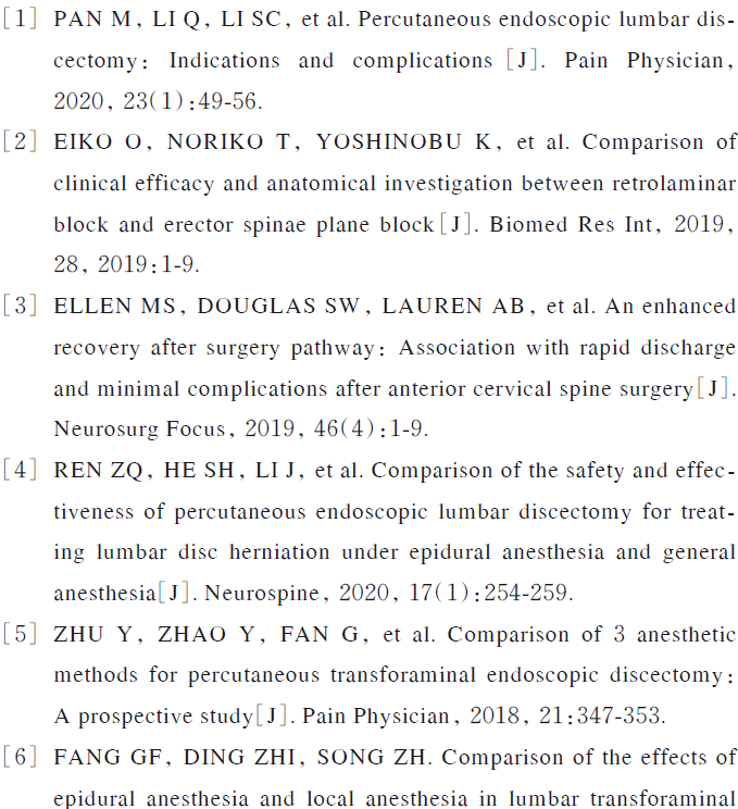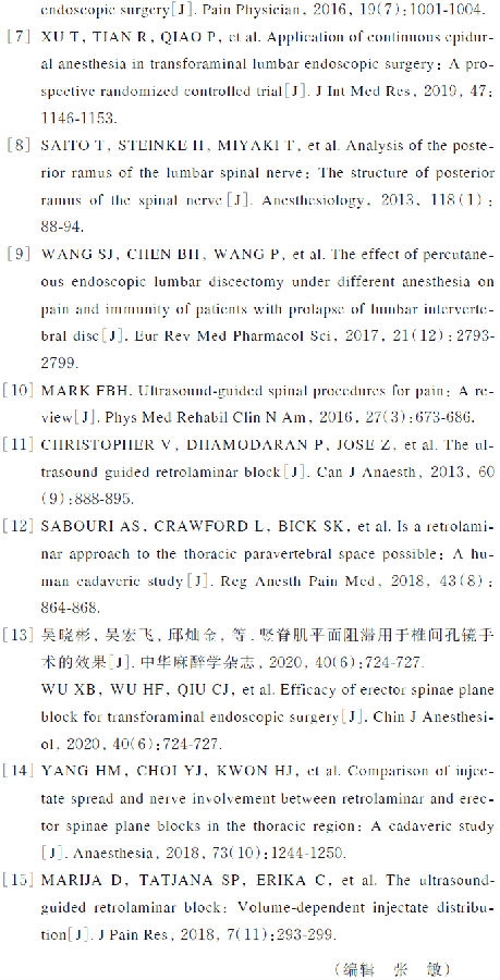 综上所述,与局部浸润麻醉相比,超声引导下椎板后阻滞可为PELD手术提供满意的镇痛效果,且不良反应少,安全性和患者满意度高,值得在PELD手术中推广。