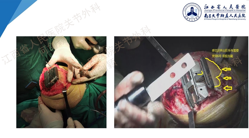 有时受限于假体器械和尺寸影响,术中截骨前脸截的会多一点,以笔者经验,截骨时可以从内侧开始,以内侧为参照,或用香蕉片刮刀去比对,如果内侧截骨切迹很厚,那么要上移调整截出钢琴面,通常是外侧斜面60°到70°。
