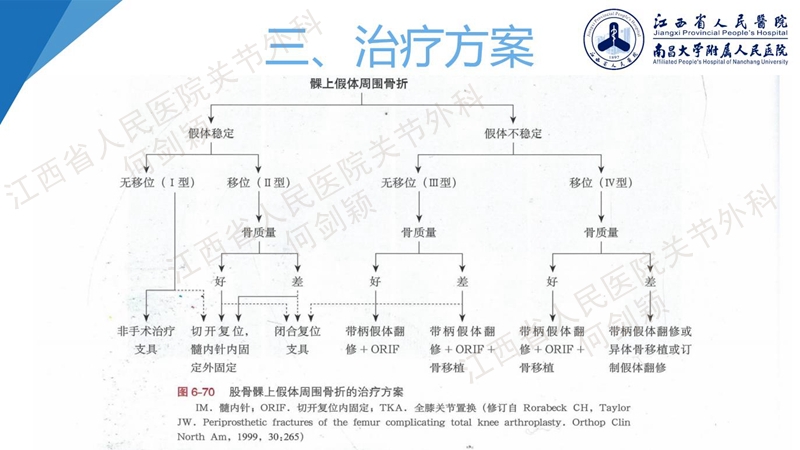 根据文献,股骨假体周围骨折分型常使用Rorabeck分型,Ⅰ型是骨折无移位,假体稳定;Ⅱ型是骨折有移位,但假体稳定;Ⅲ型是骨折累积的髁间假体不稳定,髁间假体之间存在松动。