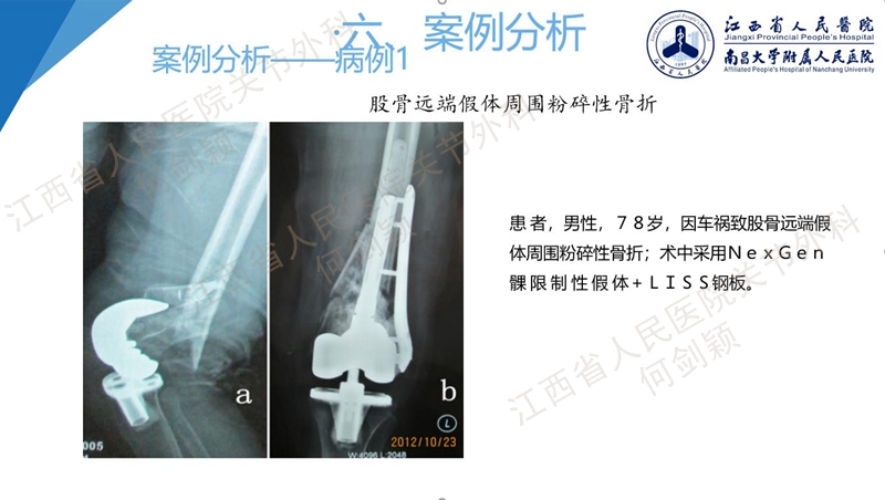 也有使用髁间股骨远端髓内钉联合锁定钢板的方案,也可以使用NexGen髁限制性假体。使用NexGen假体,前提是假体松动,必须先使用克氏针或是临时固定,方便给予植入髓内固定延长,置入后经过植骨或交叉稳定或骨水泥技术,方便长入。