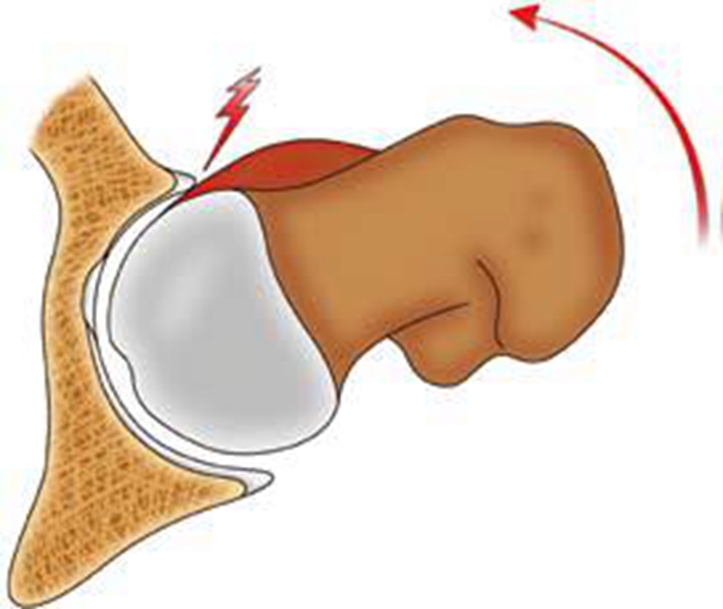 在髋关节屈曲动作的基础上,如果再加上内旋的动作,对于盂唇的刺激会加倍增大,这也是临床上判断是否存在髋关节撞击综合征的一个常用检查,称为前方撞击试验。