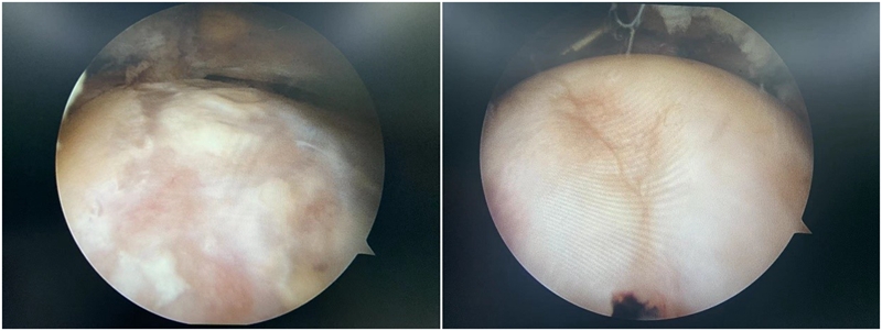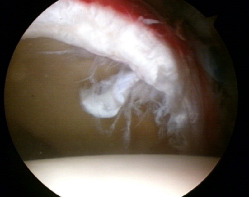 图4 髋关节镜术中图片,可见明显盂唇撕裂伴充血