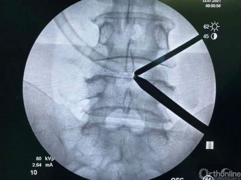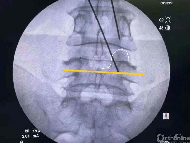 术前克氏针确定内镜口位置位于椎板稍微偏远,是一个比较理想的定位。