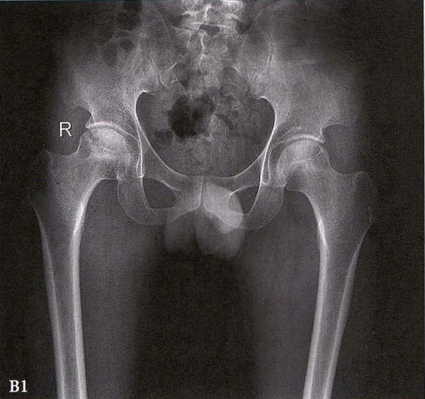 B.男性,31岁,双侧股骨头坏死,双侧均为Ⅲ期。X线片示双侧股骨头密度不均、股骨头稍变扁(B1)。MRI(T1加权像)示股骨头内多发不规则信号带(B2),股骨头内凸向大转子的双线征(白色箭)和软骨下骨骨折(白色三角)。