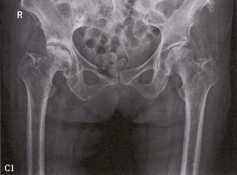 C.女性,89岁,右侧股骨头坏死Ⅳ期。X线片示右侧股骨头压缩变扁,右侧髂臼密度增高,关节内侧间隙狭窄、不均匀(C1)。MRI示右股骨头压缩变扁,右髋关节腔比较多积液(C2)。