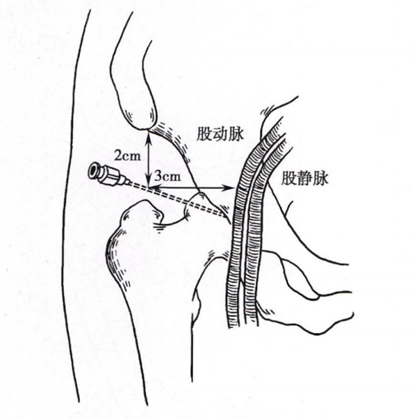 ①前侧入路:将患者下肢放于中立位,触及骼前上棘和耻骨结节,在腹股沟韧带下方2cm,股动脉的外侧垂直剌入;也可以在骼前上棘下方2cm,股动脉搏动点外侧3cm,将穿刺针向后内方60°刺入(图4)。