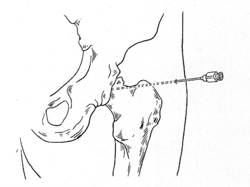 ②外侧入路:将患者下肢轻度内收,从股骨大转子尖端上缘,平行于股骨颈前上方,将穿刺针刺入(图5)。