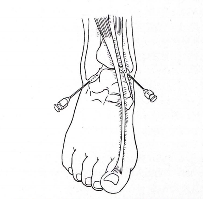 ①前内侧入路:将患者踝关轻度跖屈,在胫距关节水平,胫骨前肌腱内侧,将穿刺针向外后方刺入。