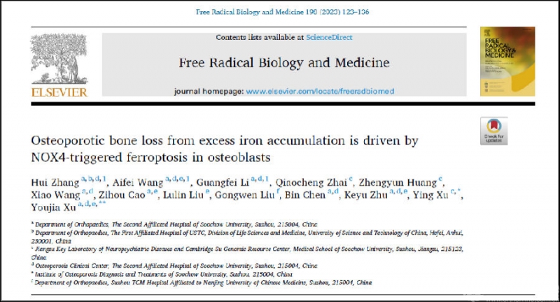 2022年11月该刊发表了“Nox4 promotes osteoblast differentiation through TGF-beta signal pathway”原创研究论文;2023年2月该刊又发表了“Osteoporotic bone loss from excess iron accumulation is driven by NOX4-triggered ferroptosis in osteoblasts”原创研究论文。两篇论文第一作者、第一通讯作者单位均为苏州大学附属第二医院。