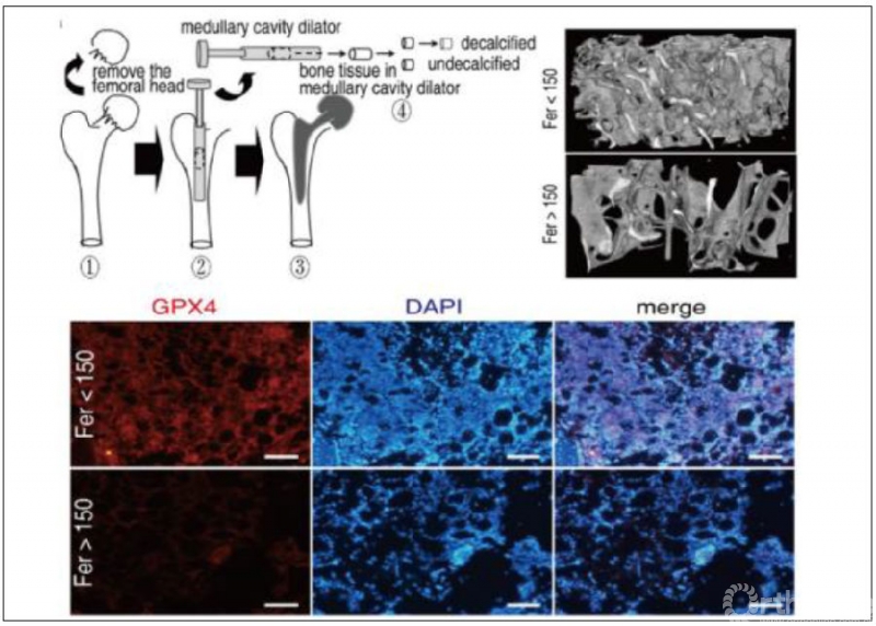B、人体骨组织 μCT 及免疫荧光:铁蓄积与 GPX4 显著相关