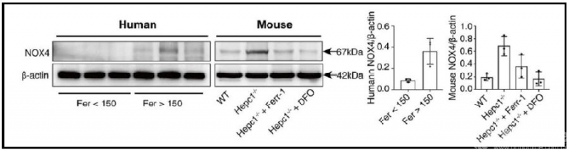 E、双荧光报告验证:铁蓄积可激活 NOX4 表达