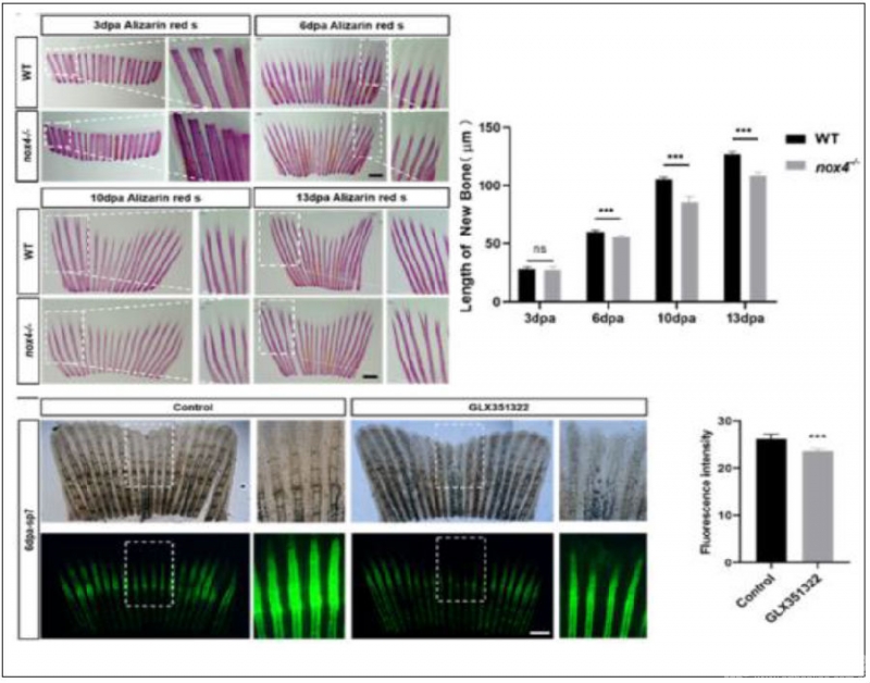 B、鱼尾再生和荧光观察 nox4-/-斑马鱼成骨细胞情况