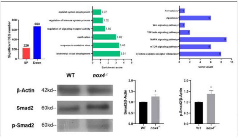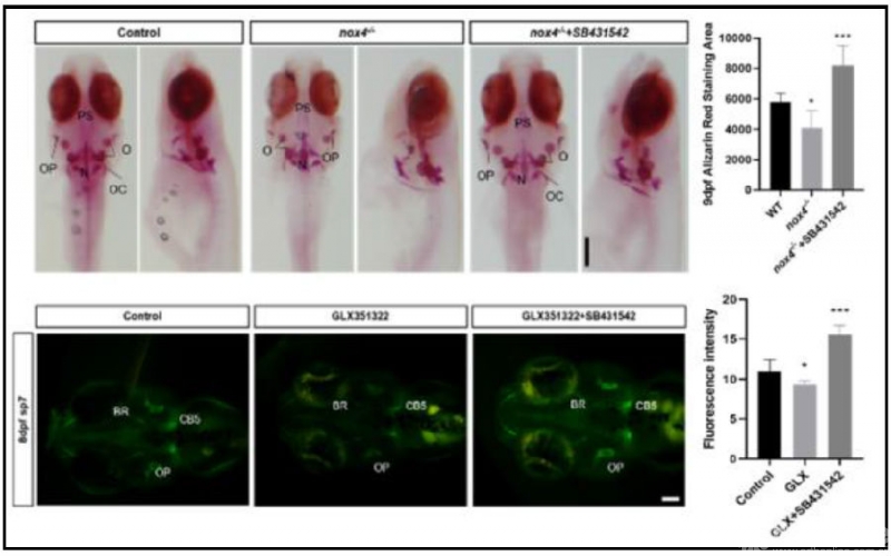该研究采用CRISPR/Cas9技术成功构建nox4敲除斑马鱼模型,为nox4缺失对骨发育的骨矿化提供重要平台。围绕NOX4缺失后成骨细胞功能相关指标结果:①.斑马鱼硬骨染色、μCT显示nox4-/-组早期发育中骨矿化显著减少;②.荧光观察、鱼尾再生实验显示nox4-/-组成骨细胞数量显著减少;③.转录组学分析显示nox4-/-组中TGF-β信号通路被显著激活;④.抑制TGF-β信号传导可挽救nox4-/-组的骨骼发育异常、显著增加成骨细胞数量;⑤.人骨肉瘤细胞(Saos-2)上验证TGF-β信号通路,阐明nox4的作用机制在人骨细胞中发挥相同的作用。