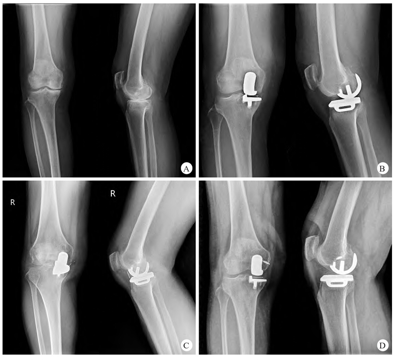 A.术前右膝正、侧位X线片显示膝关节内侧间隙变窄;B.术后1周右膝正、侧位片X线片显示假体位置良好;C.术后6个月下蹲站立后出现右膝关节疼痛,右膝正、侧位X线片提示衬垫向前方脱出;D.更换新的原厚度衬垫+内侧副韧带锚钉固定术后1个月,右膝正、侧位X线片显示衬垫位置良好,假体对位恢复正常