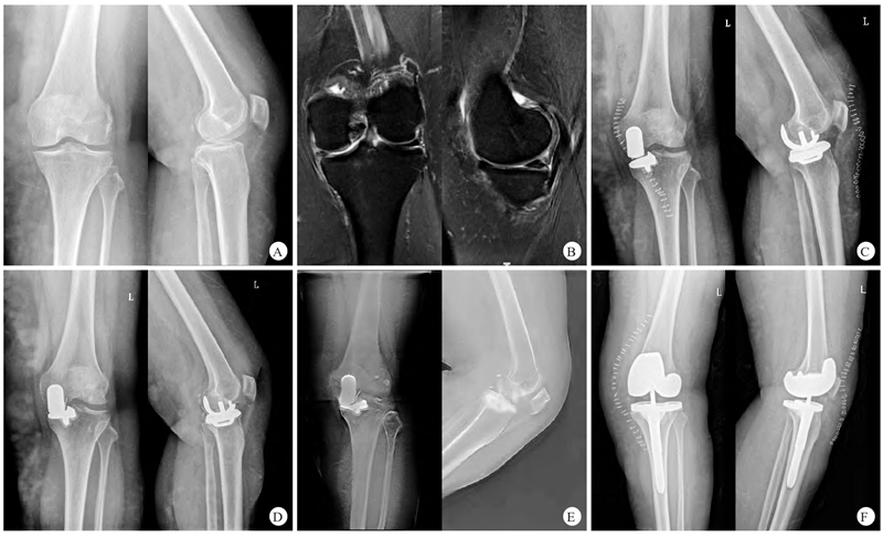 A.术前左膝正、侧位X线片显示内侧间隙变窄;B.术前左膝MRI提示左膝关节退行性病变,内侧软骨磨损;C.术后1周左膝正、侧位X线片显示假体位置良好;D.术后12个月后因外伤摔倒后出现左膝关节疼痛,左膝正、侧位X线片可见衬垫向后外方脱位;E.术后12个月左膝矢状位及冠状位数字化体层融合成像提示衬垫向后外方脱位;F.全膝关节置换翻修术后2周左膝正、侧位X线片显示假体位置良好