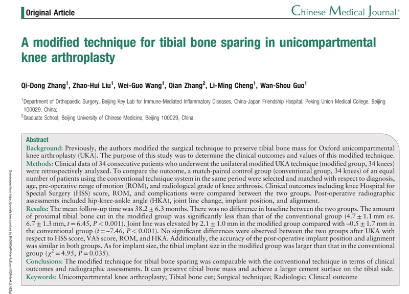 具体请参考Zhang Qidong, Liu ZH, Wang WG, Zhang Q, Cheng LM, Guo WS. A modified technique for tibial bone sparing in unicompartmental knee arthroplasty. Chin Med J (Engl) 2019; 132(22): 2690-2697.
