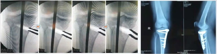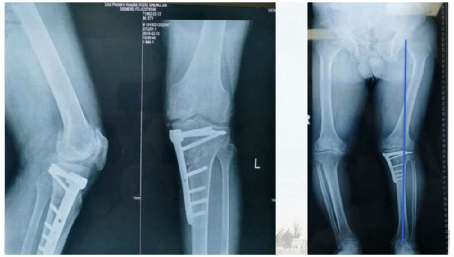 随后用骨刀继续向前敲,做HTO内侧开放楔,截骨完成后内侧固定,并测量下肢力线,此时达到术前设计的要求。