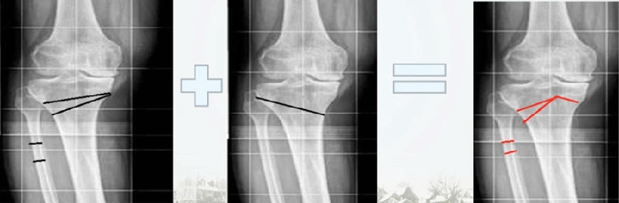结合影像学来看,该患者单纯用闭合截骨或开放截骨,对肢体均有影响,所以决定采用混合型截骨。术中混合截骨旋转中心选在内外1/3处,先做闭合楔,然后顺势将开放楔敲开,达到术前设计的目标力线。术后随访力线达到要求。
