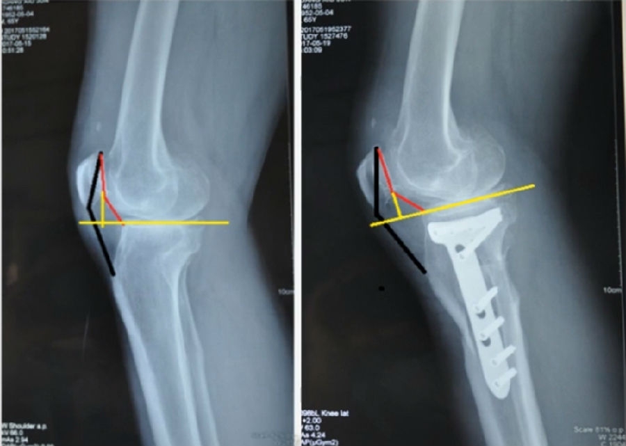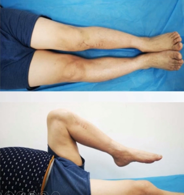 第二次来院做另一侧肢体时,采用下行截骨,术后患者髌骨高度,无论用哪种方法测量都无明显变化,而且患者膝关节功能迅速得到恢复。