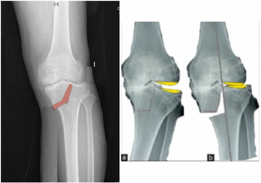 去除外侧一个楔形骨块,将下肢力线外翻来降低内侧间室的压力。