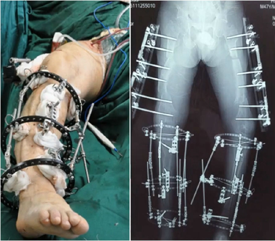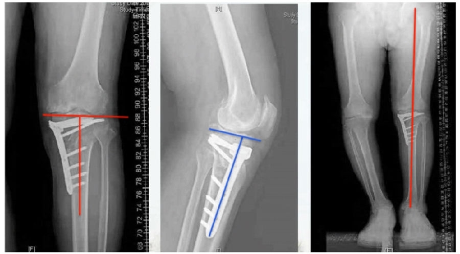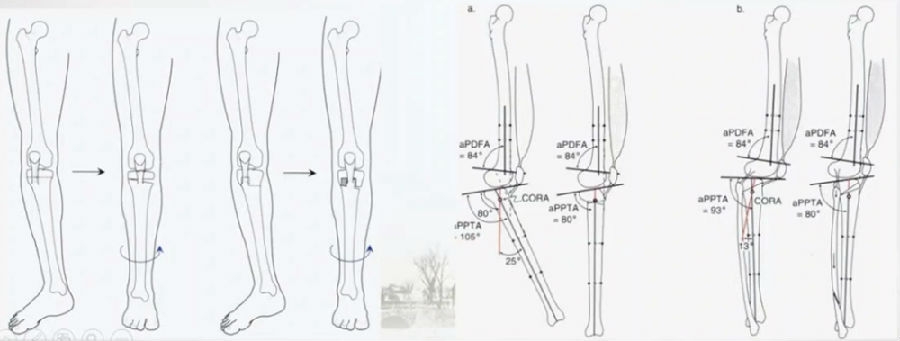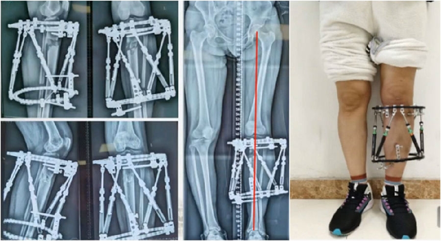 当膝关节MCOA合并旋转畸形,膝关节过伸、屈曲缩畸形,肢体短缩等复合畸形时,可以通过联合胫骨结节截骨、改变胫骨的后倾角度等矫正,但内固定矫形存在较大的局限性,可考虑外固定架。