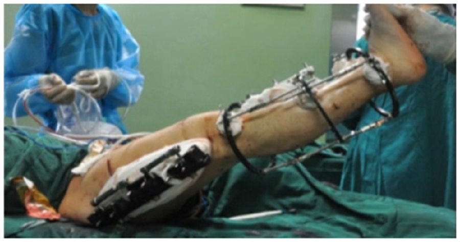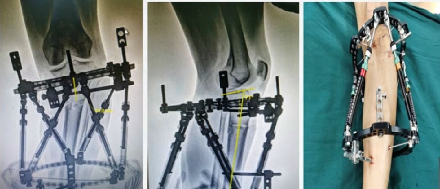 泰勒外固定架缓慢矫正短缩、内翻、前弓、内旋。