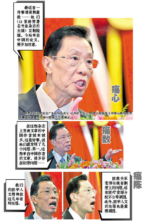 钟南山痛批当前科技界的浮躁风。他说,多家国际专业杂志主编批评中国某些科学研究论文存在“四宗罪”:一是伦理问题,二是造假,三是抄袭,四是一稿多投,并互相提醒对中国论文“多加注意”。