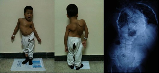 小幸保今年7岁,自幼即发现脊柱侧弯,畸形不断进展,严重影响了身体发育和心肺功能。入院查体发现患儿剃刀背畸形明显,双肩不等高,躯干严重失衡。脊柱侧弯僵硬,而且身材矮小,身高仅95cm。经过详细的辅助检查还发现该患儿胸段多发椎体发育畸形,侧弯高达88°,手术难度极大,风险极高。