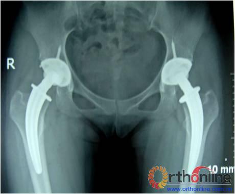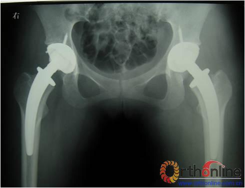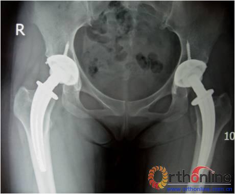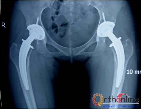 本组病例术后无感染、下肢深静脉血栓、关节脱位、异位骨化、大腿痛、假体松动下沉等并发症发生。平均随访18.1个月,优7髋,良2髋。X线片上股骨假体与远端股骨髓腔匹配良好,假体周围骨无骨吸收与溶解,假体在位率高。而且,疼痛解除,无跛行,效果令人满意。