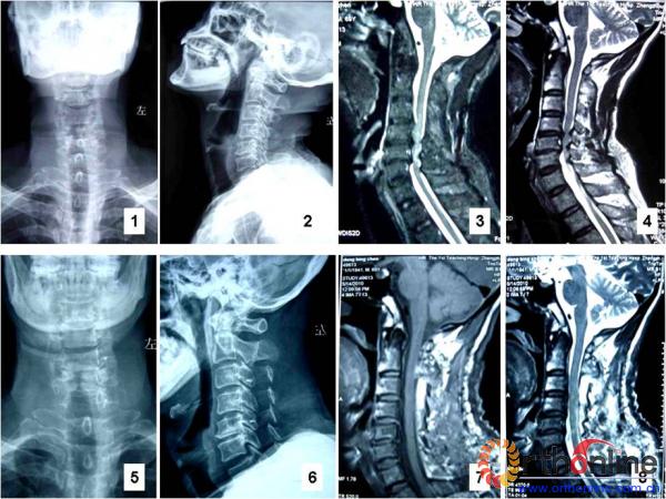 图1 董XX,男,69岁,多节段脊髓型颈椎病。1,2:术前颈椎正侧位X线片;3,4:术前MRI显示,C3-4脊髓前方受压,C6-7脊髓后方受压,C4-5、C5-6为钳夹型,脊髓前后方均严重受压;5,6:术后颈椎正侧位X线片,可见3个锚钉影像;7,8:术后MRI显示,C3-7脊髓前后方压迫获得解除,病人病情明显好转,疗效为优