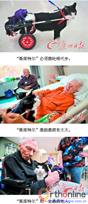 美国一只名为“斯库特尔”的猫咪因后腿截肢,不得不安装类似轮椅的装置帮助行走。主人还定期带它前往康复医院和疗养院,让它担负起志愿者的角色,安慰和激励病患。