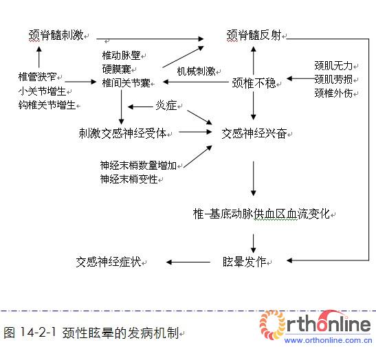 颈椎失稳,刺激颈部(椎动脉壁、颈髓硬膜、小关节囊、韧带、椎间盘纤维环等处)的交感神经受体,反射性引起椎基底动脉收缩导致椎-基底动脉供血发生改变导致眩晕发生。失稳节段颈部炎症组织释放的各种炎性介质,是颈性眩晕发生的重要基础之一。颈椎失稳程度较严重或局部退行性变化严重时,机械性刺激可使颈椎失稳节段周围组织可产生炎症,各种炎症介质降低了交感神经末梢的兴奋阈值,机械性刺激使交感神经易于兴奋,导致椎-基底动脉血流改变引起眩晕频发且持续时间可以延长到数日甚至数周。作者对出生4个月-88岁20例尸体解剖中的颈椎神经根、神经节和脊神经被膜的神经末梢进行了病理学定量研究,在其神经根、神经节和脊神经被膜内找到大量的游离神经末梢,其数量随年龄增加的增多,并发现高龄者神经末梢有严重变性,其数量增多及其变性特点可能与本病中老年患者较多有关。张清等用电刺激猫分布于椎动脉的神经,观察其椎动脉变化,结果当刺激量达到一定程度时,椎动脉收缩,停止刺激椎动脉复原,结论颈椎失稳是颈性眩晕的重要病因,颈椎骨赘是其发病的基础。于腾波的家兔实验结果表明电刺激颈交感神经节可以使椎动脉血流减少,局麻药阻滞颈交感神经节后再行电刺激不能使椎动脉血流减少,证实了交感神经刺激对椎动脉血流减少的影响。我们推论颈椎外伤,颈椎劳损,颈部肌肉无力可造成颈椎失稳;颈椎小关节增生,钩椎关节增生,颈椎管狭窄使得颈脊髓,椎动脉壁、颈髓硬膜、小关节囊、韧带、椎间盘纤维环等处的交感神经受体更加容易受到机械性刺激;颈部组织的炎症及其释放的炎性介质降低了交感神经兴奋的阈值,交感神经末梢的变性使得交感神经兴奋性增加。上述因素相互作用最终引起交感神经兴奋,椎-基底动脉血流改变发生眩晕(图14-2-1)。国内外均有报道颈硬膜外封闭或颈交感神经节封闭可以阻断交感神经的传导,可以改善椎基底动脉血供既可帮助诊断本病也可产生一定的治疗效果,并从另一个角度证实了本病的交感神经作用机制。