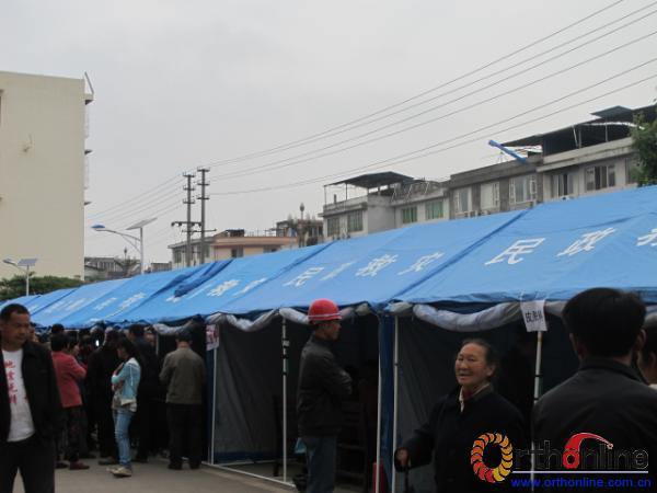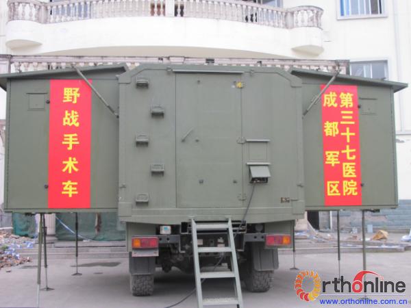 和院长进行了简单的接洽以后,专家医疗队在原门诊楼外的集中帐篷门诊区找到了一个闲置的帐篷,征得院领导的同意以后,我们将这里设为“国家专家医疗队-中南大学湘雅二医院”医疗点。医疗点的正前方,摆放着成都军区第三十七医院的野战手术车。
