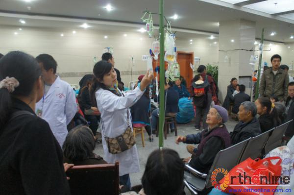 间或要送病人到急诊室输液,看着不大的空间里挤满了病人,医疗队员未免担心,仔细查对病人信息,生怕出了差错。