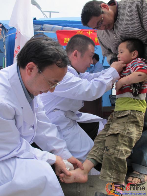 上午10点,3岁的浩然由爸爸妈妈带着来到我院医疗点前。爸爸告诉医生,浩然皮肤过敏,长了很多疹子,可能是痒的缘故,孩子总是不停地哭闹。打开浩然的衣服,脱下孩子的鞋子和袜子,看见布满双脚的皮疹,“手足口病”的诊断跳入薄教授的脑海,紧接着看看孩子的手和口腔,孩子的症状证实了他的诊断。为了确保诊断无误,传染科的张永红教授和医院感染控制中心的童德军主任也来查看病人,最后大家一致认定了“手足口病”的诊断。至此,4•20雅安地震以来,我院专家诊断出第一例手足口病。